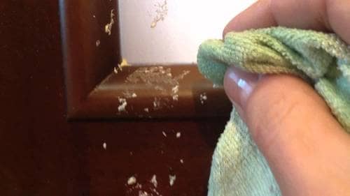 Окна и двери из дерева покрыты лакокрасочным материалом, боящимся растворителей, масел, механических воздействий. На помощь придёт раствор из 1 ст. л. кухонной соли и 1 стакана воды. Приготовленная жидкость очистит монтажную пену с двери, если загрязнённый участок обильно смочить на 5 минут, а потом протереть чистой влажной ветошью.