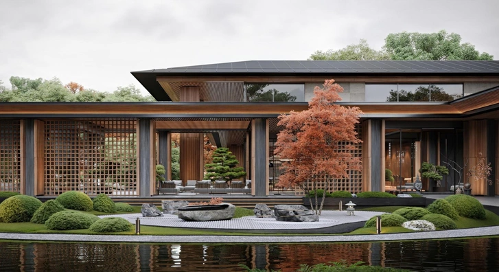 За последние года два вырос интерес к азиатским мотивам, поэтому в современную архитектуру часто интегрируют принципы Васту, философию фэншуй и японскую культуру. Однажды к нам обратился заказчик с просьбой создать резиденцию, вдохновленную Страной восходящего солнца. Это помогло бы жене меньше тосковать по родным краям. Мы старались отразить архитектурные принципы Японии: простоту, уединенность, покой и единение с природой.
