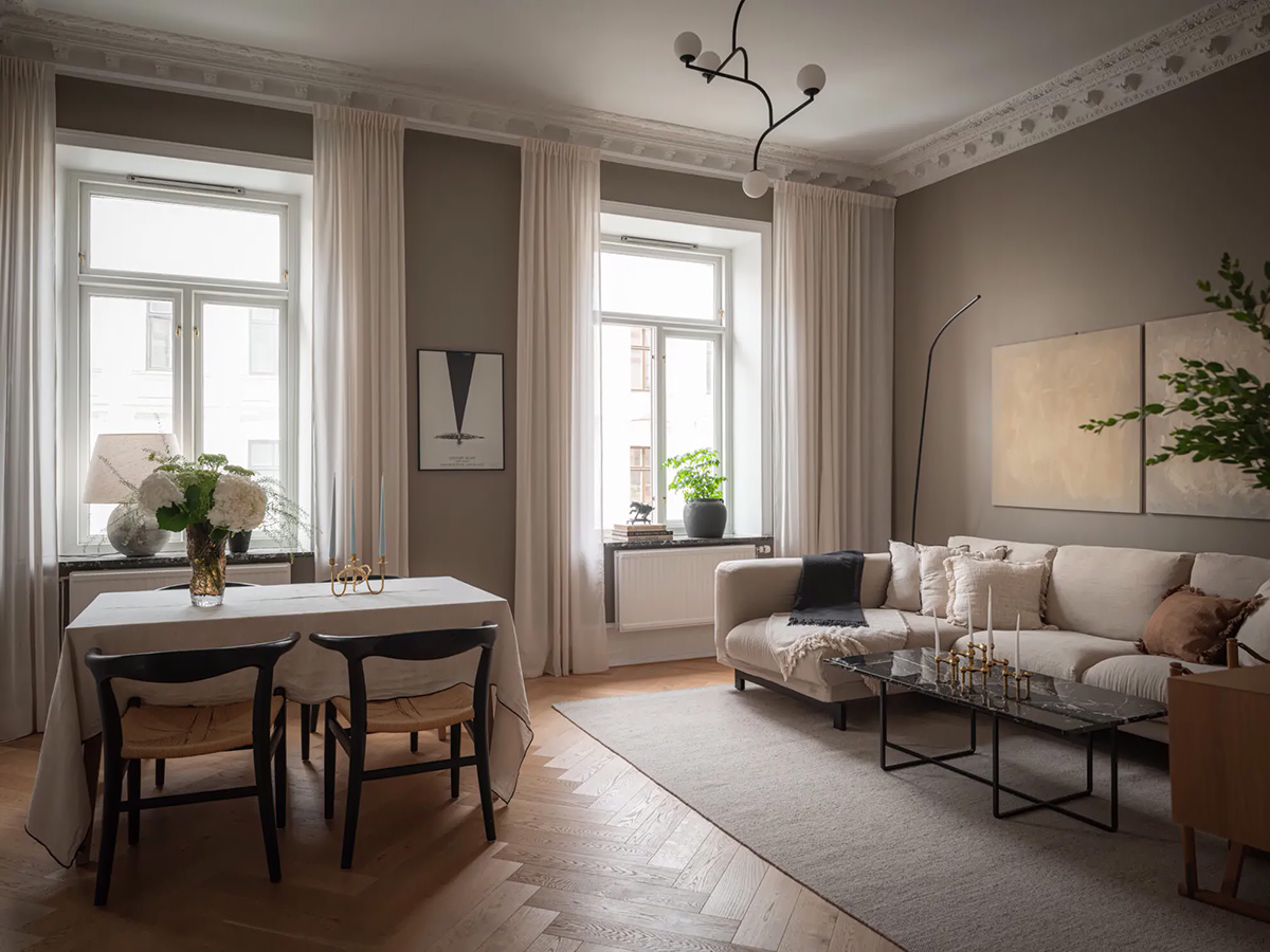 Настроение в интерьерах этой квартиры в старом доме в Гетеборге создают стены — теплый бежево-серый оттенок делает пространство спокойный и слегка приглушенным. В этом же время элегантные классические детали декора, подчеркнутые белым цветом, сморятся очень выразительно и эффектно на фоне таких стен, а современный скандинавский декор с лёгкими черными акцентами придаёт стиля пространствам. Выдержанно и красиво!