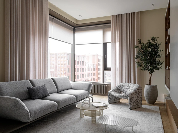 Диван, Wohl design. Журнальные столики, Moroso, Flat interiors. Текстиль на окнах, Anna Miller. Ковер, KulturaKovrov. Декоративное дерево и кашпо, Treez Collection.