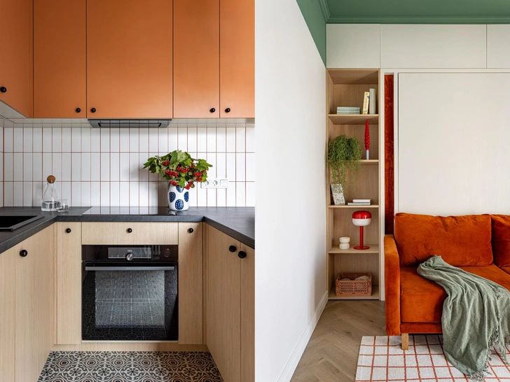 Визуальная доминанта здесь кухня: несмотря на то, что ее не отделяют ни стены, ни перегородки, она выглядит самостоятельно. Все благодаря колорблоку — мы покрасили часть стен и гарнитура в солнечный персиковый цвет. Того же оттенка даже затирка на фартуке.