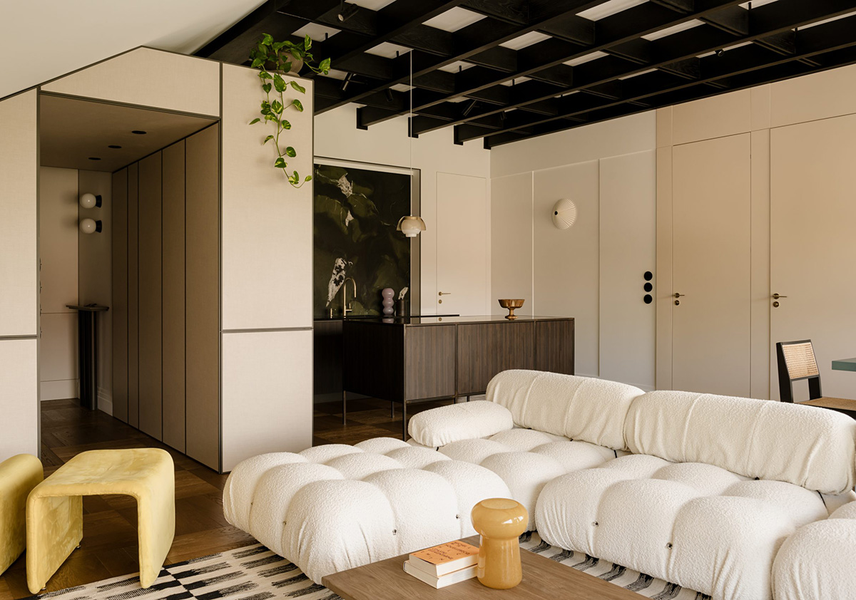 Эффектный современный дизайн мансардной квартиры с сауной в Кракове