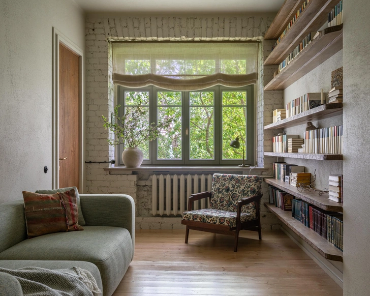 В квартире удалось задействовать каждый сантиметр, включая холодный шкаф 1920-х под окном — для дверки я специально рисовала эскиз, отсылающий к фасадам советских буфетов. Важно было сохранить ось от входной двери к окну с видом на Никольскую церковь, откуда каждый день доносится звон колоколов. Несмотря на скромные габариты, в квартире получилось комфортно разместить 9 спальных мест (включая раскладные диваны и кресло), встроенные шкафы и две библиотеки.