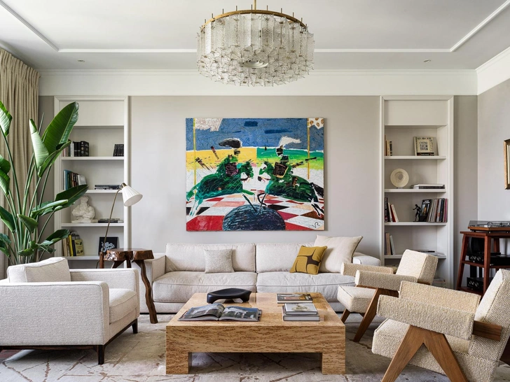 Гостиная. Стол из карельской березы сделан на заказ по эскизам хозяйки квартиры, Hagit Pincovici. Кресла, Cassina, в ткане Le Manach, Pierre Frey. Диван, Casamilano, в ткани от Pierre Frey. Ковер, Kelly Weastler. Люстра, винтаж, 1970-е. 1stdibs.