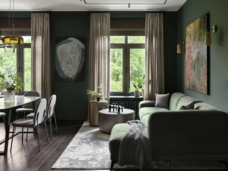 Анна ландшафтный дизайнер, она любит растения и все оттенки зелени, поэтому основным цветом в интерьере стал зеленый. В целом, в этом проекте я много работала с цветом, чтобы создать в каждой комнате свое настроение.
