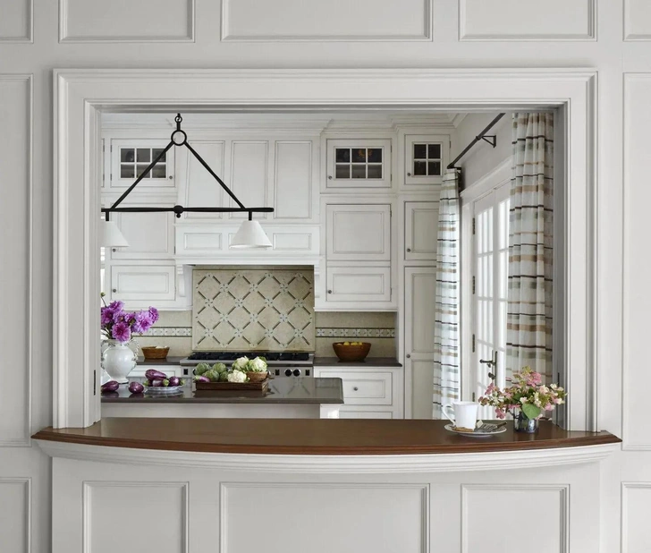 Сегодня дизайнеры предлагают уйти от стандартного прямоугольного проема. В тренде — арочные формы, окна во всю стену, напоминающие витрину, или комбинации с барной стойкой, где нижняя часть — это столешница, а верхняя — остекленный проем.