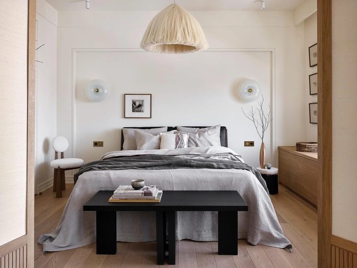 Скамья, дизайн Юлии Шакун и Марины Польской. Над кроватью — графика Николая Власова. Бра, винтаж, Unique Piece Gallery. Стул, Modenature. Тумбы, Savour Design.