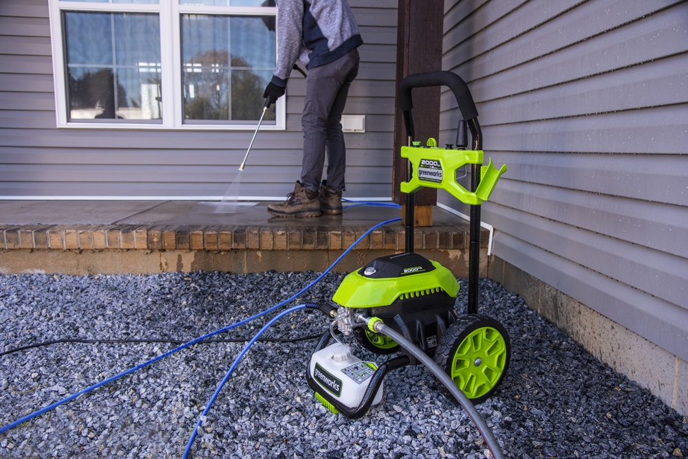 При текущем тренде бережного отношения к экологии важно, чтобы производитель техники совмещал продуманную эргономику, мощную техническую часть и экологичный подход. Именно поэтому мы выбрали для разбора Greenworks GHP2000, она предлагает сбалансированное решение между производительностью, долговечностью и комфортом. Электрическая мойка высокого давления развивает давление до 140 бар и обеспечивает производительность до 360 л/ч. Это особенно заметно при работе с мхом, въевшейся уличной грязью и следами шин. При этом наличие трёх сменных насадок и отдельной форсунки для моющего средства делает её гибким инструментом под разные задачи.