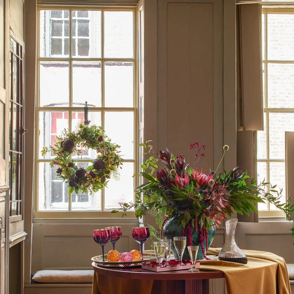 Еще напомним, что украсить стоит не только стол, но и то, что вокруг — подвесьте над ним гирлянды или декоративную композицию, а стену рядом оформите большим новогодним венком.