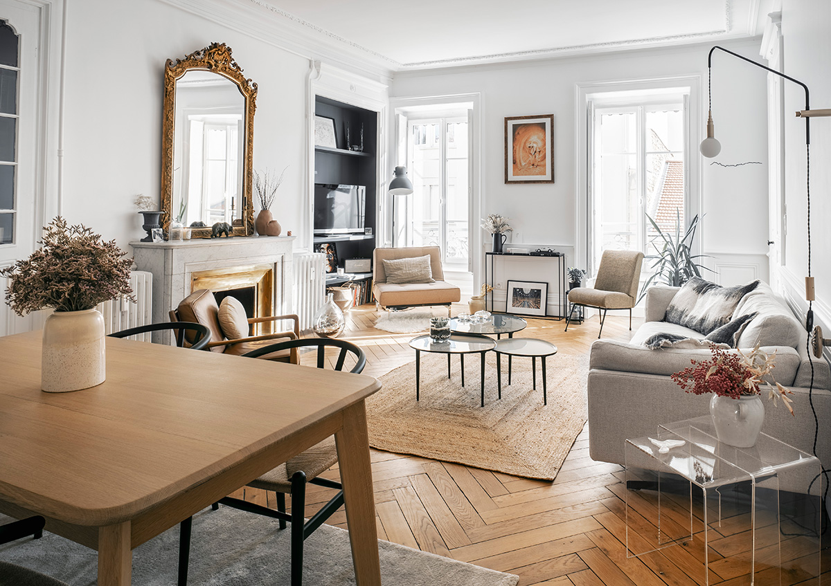 Изначально дизайнеры французской студии Castille планировали снести несколько стен в этой квартире в Лионе, чтобы исполнить пожелание новых хозяев сделать интерьер максимально открытым. Но в процессе строительства оказалось, что большинство стен — несущие, поэтому им пришлось искать другие методы и приёмы. Так, основа интерьеров квартиры почти везде белая, что в сочетании с большими окнами лишь подчеркивает классические достоинства пространства. Очаровательный интерьер с лепниной и экзотическими нотками!