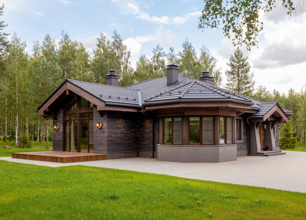 Дом возведен из керамических блоков на плитном фундаменте. Фасад выложен ригельным кирпичом, кровля — из керамической черепицы. Цоколь облицован гранитом габбро-диабаз. Подшивка свесов кровли и подиум перед входом в гостиную выполнены из термоясеня и термоклена.