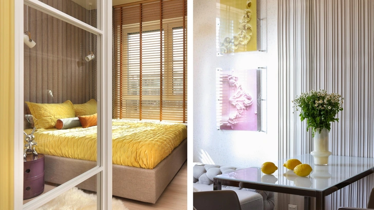 Функциональные зоны в квартире выделены очень четко: так, в прихожей царит сочный желтый цвет, создающий ощущение солнечного света, в гостиной с помощью шпонированных обоев выделен несущий выступ, а в столовой использованы вертикальные полосы разноцветных гипсовых панелей.