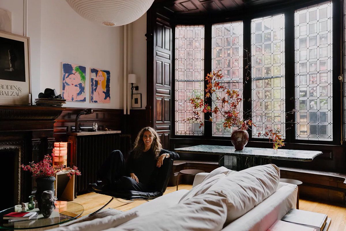 В необычной нью-йоркской квартире дизайнера Talia Mayden царит особая, романтичная атмосфера. Хозяйка говорит, что очень редко использует общий верхний свет в доме и предпочитает только настольные лампы, бра и торшеры. Но самый главный элемент в её интерьере — это уникальное роскошное эркерное окно на всю стену с деревянным оформлением и потрясающими витражами. Это поистине маленький архитектурный шедевр, который задаёт тон и настроение в квартире. Очень атмосферный интерьер!