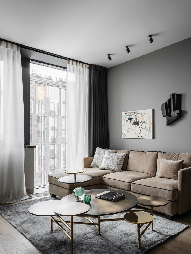 На журнальном столике  — вазы Lege Alto, RetroNord. Декоративные подушки, Charles Cameron. Ковер, Le Kovёr. Картина Дмитрия Распопова «Ride on the bicycle», галерея Art Brut. Барельеф «Город» Ульяны Хохловой, галерея Art Brut.Фото