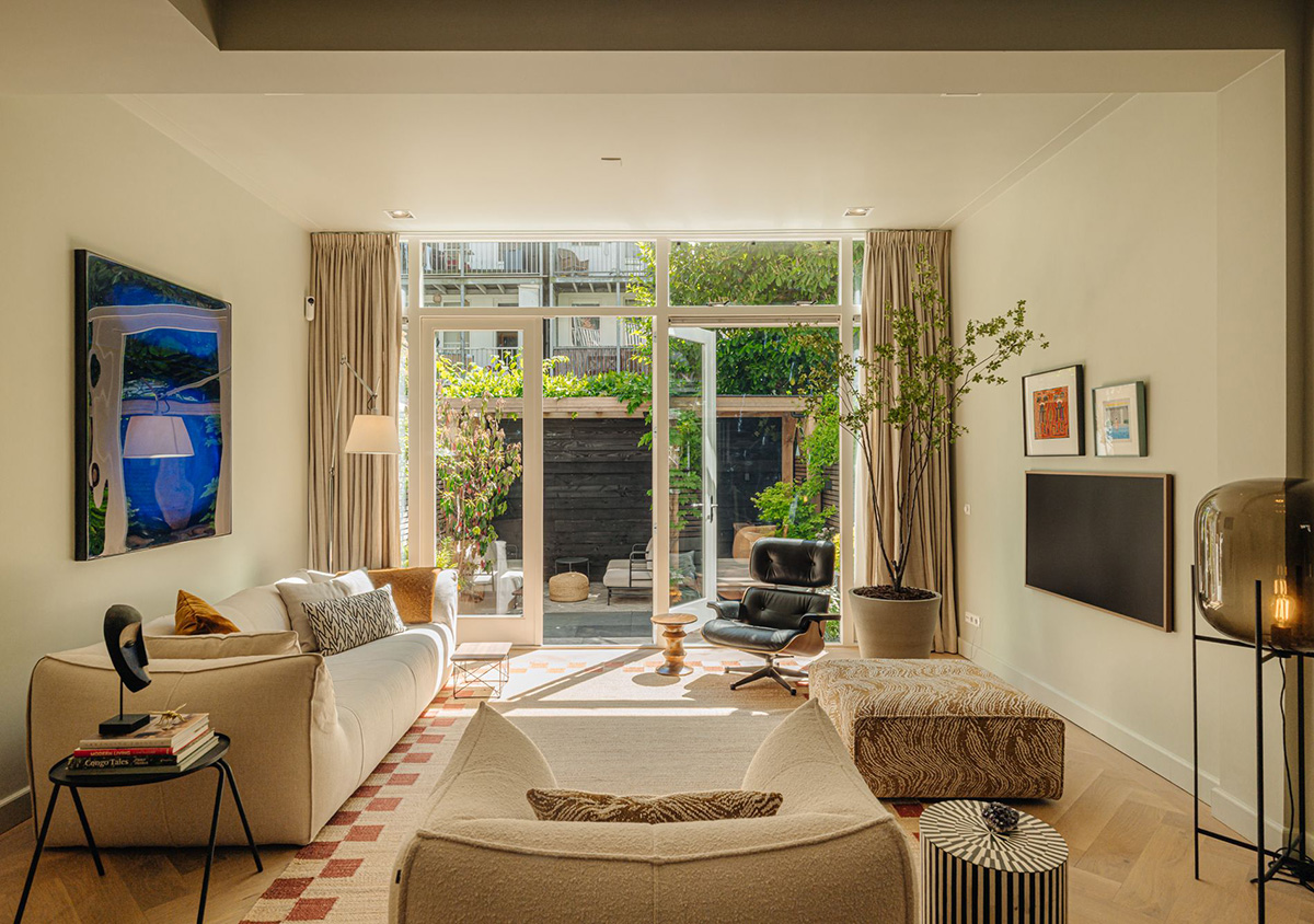 Несмотря на то, что эта квартира расположена на первых двух этажах 100-летнего таунхауса у канала в центре Амстердама, в её интерьерах почти ничего не выдаёт исторический характер дома. Дизайн выполнен в современном ключе с лаконичными линиями и в мягкой нейтральной гамме. Окна главной гостиной здесь выходят не на канал, а на заднюю часть дома, где имеется приятный небольшой сад с зоной для отдыха под открытым небом. Стильно и уютно!