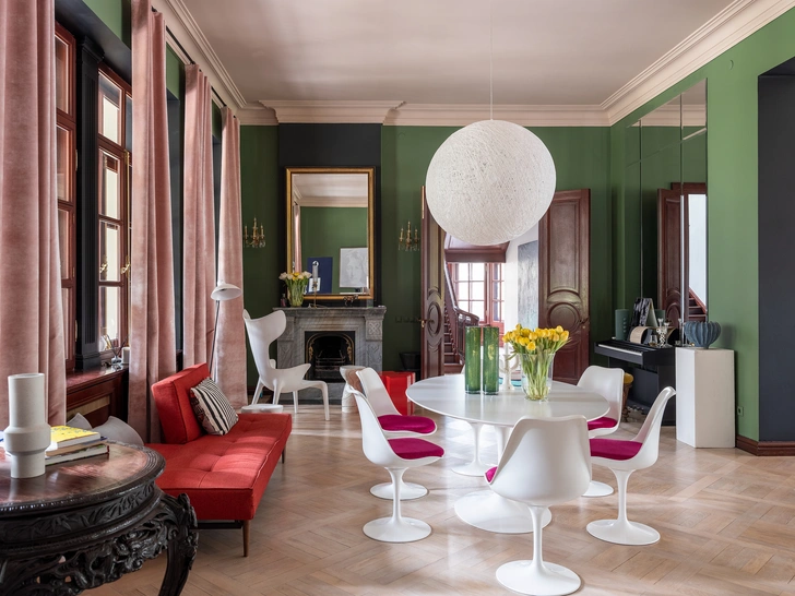 Сочетание насыщенного красного и глубокого зеленого создает утонченную и роскошную атмосферу. Эти богатые по своей природе оттенки образуют идеальный дуэт, где винный цвет эффектно контрастирует с нефритово-зеленым. Приглушенные версии этих цветов создают успокаивающую атмосферу, в то время как их насыщенные варианты наполняют пространство энергией и драматизмом.