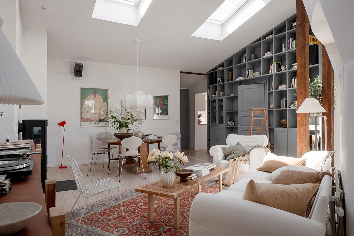 Мансардные интерьеры по определению уже являются необычными, но пространство этой квартиры на последнем этаже жилого дома у вовсе удивляет своими нестандартными характеристиками. Впечатляющие потолки с перепадами высот, радиальная стена в гостиной, окна необычных форм и конфигураций — в этом интерьере действительно много интересных деталей. Это мы ещё не упомянули прекрасную террасу с видами на крыши соседних домов. Среди дизайнерских решений выделяет, конечно же, большой книжный шкаф на всю высоту стены. Необычно и уютно!