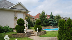 Берем кустарники и сажаем их вокруг дома, то есть ближе к заборам. Для создания оригинального образа необходимо под кустарниками разместить гладкие камешки в достаточном количестве. Будет отлично если эти камешки будут цветными и различных размеров.
