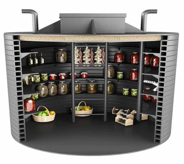 Если для вертикального варианта найдете кольца диаметром 2,5 м, будет очень неплохо, а то в двухметровом тесновато, после того как полки установятся. Есть уже готовые пластиковые погреба, но цена у них в разы выше, чем у самодельного из железобетонных колец.