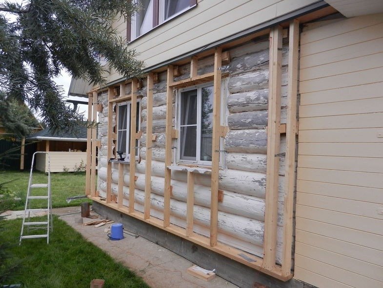 На срубе закрепляют каркас из брусков 100 х 50 мм, на котором в дальнейшем будет зафиксирована ветрозащитная плёнка и наружная отделка. Кроме того, каркас не позволит мягкой эковате выдавливаться наружу. Шаг брусков можно определять по месту, не обращая внимания на его точность, главное тщательно следить, чтобы их наружные рёбра лежали в вертикальной плоскости. |