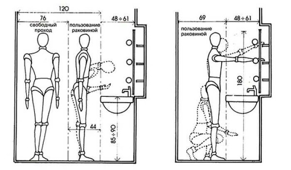 • перед раковиной должно быть свободное место — не менее 69 см;