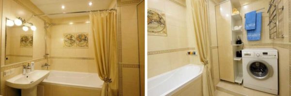 При разработке дизайна ванной комнаты в хрущевке стараются найти место под установку стиральной машины. Да, она быстрее ржавеет, но в других помещениях найти место еще сложнее. Один из вариантов уже описан — угловая душевая кабина, а в освободившемся углу — стиралка. Если это вариант не подходит, можно установить специальной формы раковину и под нее стиральную машину.