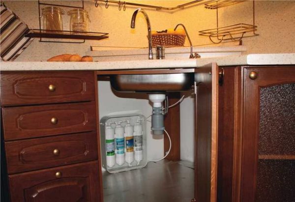 Под мойку на кухне можно ставить многоступенчатые фильтры очистки воды работающие по принципу обратного осмоса. Они идеальны, если вода имеет слишком большие отклонения от нормы. При установке обычного многоступенчатого фильтра добиться требуемого качества воды очень сложно, скорее всего, к системе надо будет добавлять ещё несколько одиночных установок, которые позволят добиться воды нормального качества. Обратный осмос в любом случае справляется с задачей, разница просто в количестве воды, которая будет сливаться с выведенными солями в канализацию (чем более жёсткая и загрязнённая вода, тем больше сливается концентрата).