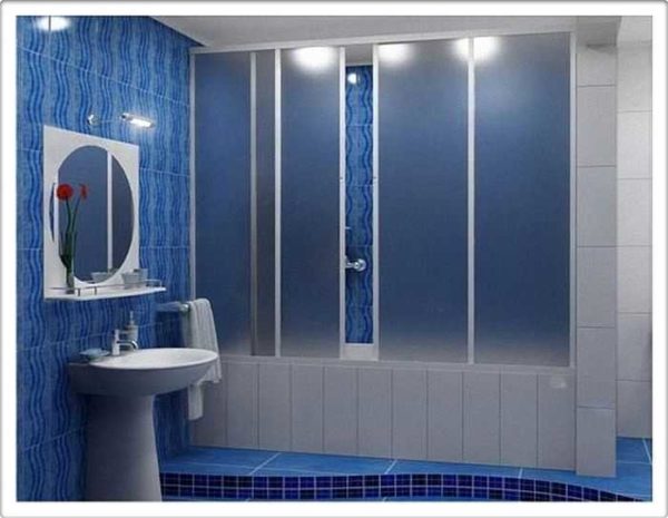 Более дорогие — пластиковые раздвижные шторки на ванную. Они стоят дороже, но гарантируют защиту от влаги. Чаще всего они выполнены из полупрозрачного пластика, так что при их установке освещенность остается достаточной. В редких случаях, при использовании непрозрачного пластика, светильники необходимо расположить непосредственно над ванной.