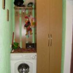 Самый проблемный вариант — коридор. Обычно в коридоре нет требуемых коммуникаций — ни канализации, ни воды. Придется их «тянуть» к месту установки, что совсем не просто. Но иногда это единственный вариант. На фото ниже есть несколько интересных решений того, как можно поставить машинку в коридоре.