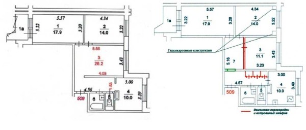 И еще планировка и ее переделка в трехкомнатную. Вернее, комнат остается две, но образуется студио — совмещенная кухня со столовой. Эта идея радикальная — кухня переносится на место жилой комнаты. Вариант может быть согласован, только при условии установки электроплиты, а также наличии технических возможностей по переносу стояков канализации и вентиляции.