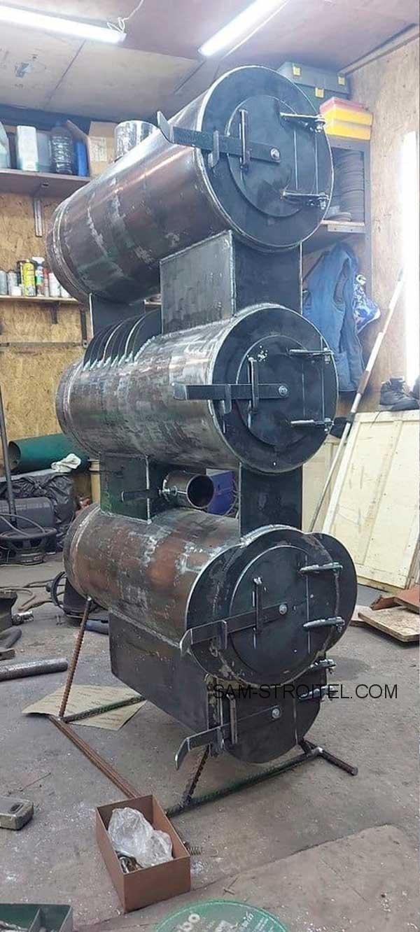 Вся конструкция печи состоит из трёх баллонов, из которых: нижний — это топка, средний — это камера для дожигания пиролизных газов и третий верхний баллон — теплообменник.