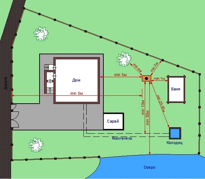 От вашего загородного дома или коттеджа септик должен располагаться на расстоянии более 5 метров. Данное правило направлено на предупреждение ошибок при установке септиков. Если установить септик под окнами, то открыть их будет практически невозможно, так как будет стоять резкий и неприятный запах. Но нужно также и знать меру, потому что при отдалённом расположении септика также могут возникнуть проблемы, связанные с прочисткой и установкой канализационных труб.От забора, соединяющего ваш участок с соседним, септик должен располагаться на расстоянии более 2 метров. Ситуации, когда запах от вашего септика доходит до соседей, случаются, им это точно не понравится, а вас привлекут, как уже говорилось ранее, к административной ответственности, но неприятностей легко можно избежать, если следовать правилам.От фундаментов хозяйственных построек (например, сараев) септик должен располагаться на расстоянии более 1 метра. Данное правило введено только из-за возможных непредвиденных ситуаций, связанных с поломкой некачественного септика.От водопроводной трубы септик должен располагаться на расстоянии более 10 метров. Такое огромное ограничение введено для того, чтобы точно предупредить возможное попадание сточных вод в водопроводную трубу. Такое может произойти в случае нарушения герметизации труб.От деревьев или кустарников септик должен располагаться на расстоянии более 4 метров. Это ограничение введено для защиты окружающей среды от чрезмерной влажности.От открытого водоёма септик должен располагаться на расстоянии более 30 метров. Данное ограничение также направлено на защиту окружающей среды, а точнее – водоёмов от возможного попадания сточных вод и загрязнённых веществ в случае каких-либо непредвиденных ситуаций.От источников питьевой воды (например, от колодца) септик должен располагаться на расстоянии более 50 метров. Данное ограничение введено по понятной для всех причине, но его можно избежать, если земля на вашем участке низкой водопроницательностью. Но шанс того, что на участке будут залегать, например, плотные глины, крайне мал, поэтому ориентироваться следует на 50 метров.