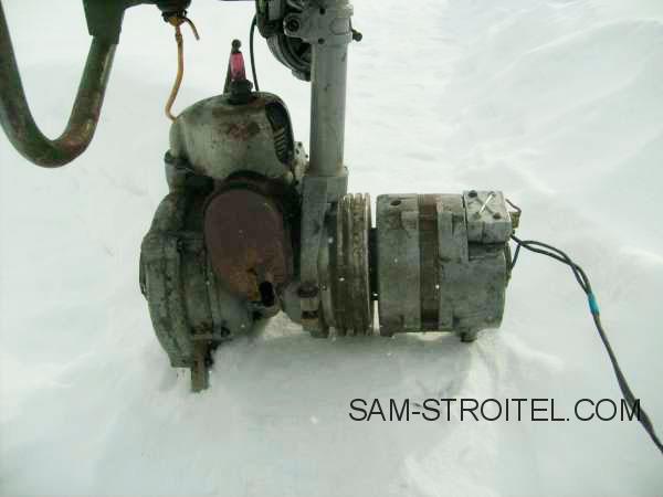 Автор этой самоделки, взял двигатель бензопилы «Дружба» и соединил его с автомобильным генератором на 12 вольт.
