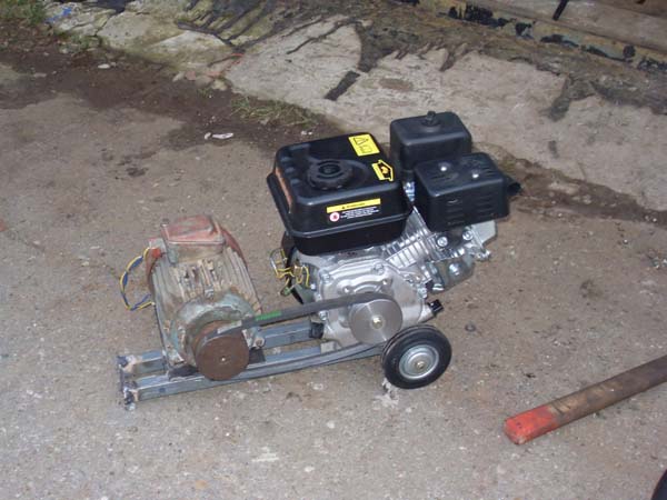 Из профильной трубы сварил простую раму, поставил пару колёс от тележки. На раму установил ДВС и асинхронный электродвигатель, поставил шкивы и ремень. Обмотки электродвигателя подключил через пусковой конденсатор.