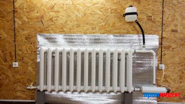 Как видно на фото, на стене за радиатором установлена отражающая теплоизоляция. Она помогает направить тепло в помещение, а не в стену, что значительно повышает эффективность обогревателя.