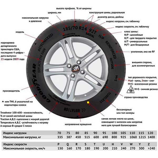 Перед покупкой необходимо определить правильный размер покрышек, который можно найти в руководстве автомобиля или на боковине уже установленных шин. Параметры включают: