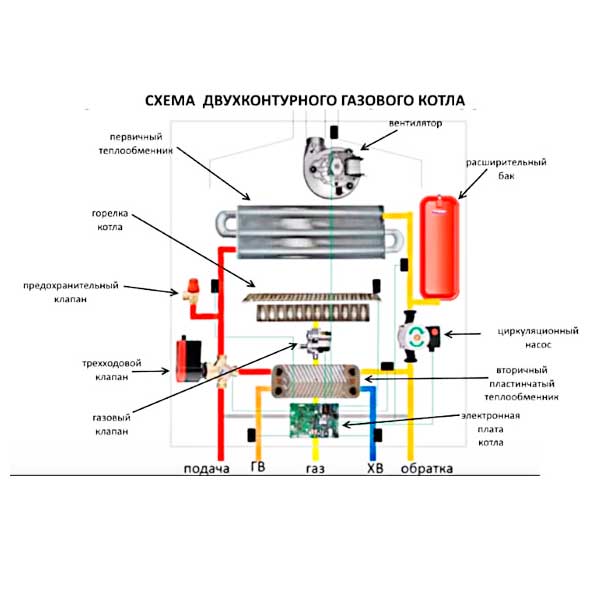 Это достигается за счёт наличия двух теплообменников: один отвечает за подогрев воды для системы отопления, другой — для горячего водоснабжения (ГВС).