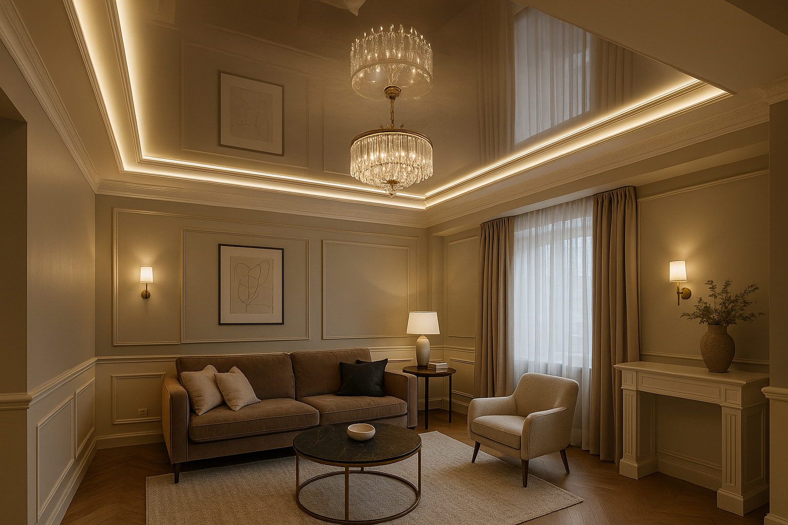 Чтобы скомпенсировать низкий потолок при зеркальной отделке, некоторые стараются создавать гипсокартонные конструкции, вписывая в них глянцевые вставки. Тогда по периметру располагают нишу для подсветки, а в центре натягивают «зеркало». Такой подход позволяет визуально приподнять центр комнаты и увести взгляд вверх, а боковые части оставить более спокойными. При этом снова вспомним про качественный монтаж: любая маленькая погрешность будет моментально заметна, ведь отражения не прощают кривых линий и неровностей. Поэтому профессиональный подход тут играет первостепенную роль.
