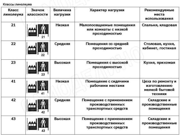 Каждый класс износостойкости линолеума имеет свои особенности и рекомендации по использованию:
