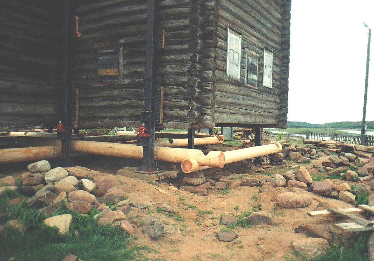 Гораздо прочнее будет, если новый нижний венец составить не из кусков, а из цельных бревен. Для этого нужно сместить всю конструкции банного сруба, поднимая его с помощью домкратов.