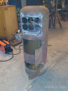 Понадобилось сделать отопление в гараже, просмотрев все возможные варианты, выбор пал на печь буржуйку из газового баллона. . На фото показан процесс пошагового изготовления самодельной буржуйки из баллона своими руками. В этой конструкции печки, реализован принудительный наддув воздуха через теплообменик из труб. Для теплообменника использованы трубы 70 мм, толщина стенки 4 мм, колосники — 14 …