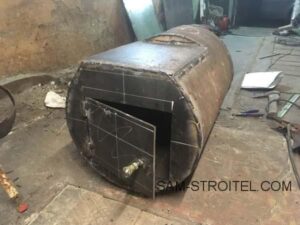 После покупки гаража, возник вопрос, как его отапливать? Решил изготовить самодельную буржуйку своими руками. . Далее на фото показан сам процесс изготовления буржуйки. Топка сделана из куска толстостенной трубы. Сделана дверца для топки, зольника в этой конструкции нет. Дымоход — 159-я труба. Сверху приварен ящик теплообменник. Внутри теплообменника приварены перегородки, которые задерживают дым и горячий