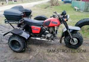 Трицикл самоделка: фото и описание конструкции. Приветствую любителей самодельной техники! Сегодня хочу показать интересный транспорт для любителей поездок по бездорожью, нечто среднее между квадроциклом и мотоциклом — трицикл вездеход. Трицикл собран на базе мотоцикла Иж Юпитер-5. Вместо заднего колеса, на раме установлен мост и пара колёс от квадроцикла. Задний мост взят от грузового мотороллера «Муравей». …