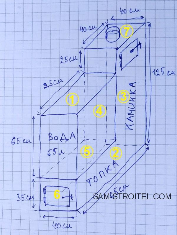 Хочу поделиться чертежами и фото изготовления печи для бани, сваренной из листа металла стандартного размера 250х125 см, толщиной 3 мм.