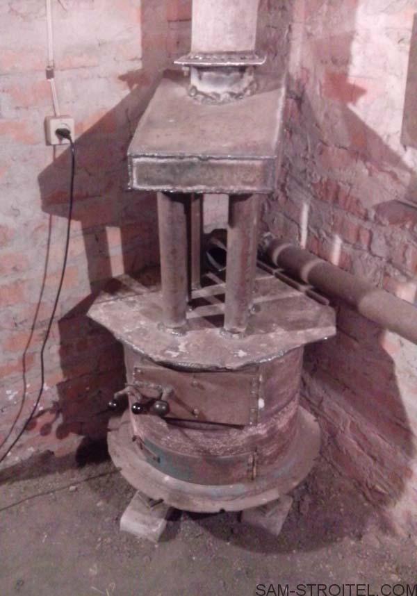 Самодельная печь для гаража, сделанная из колёсных дисков, может работать на дровах и отработке.