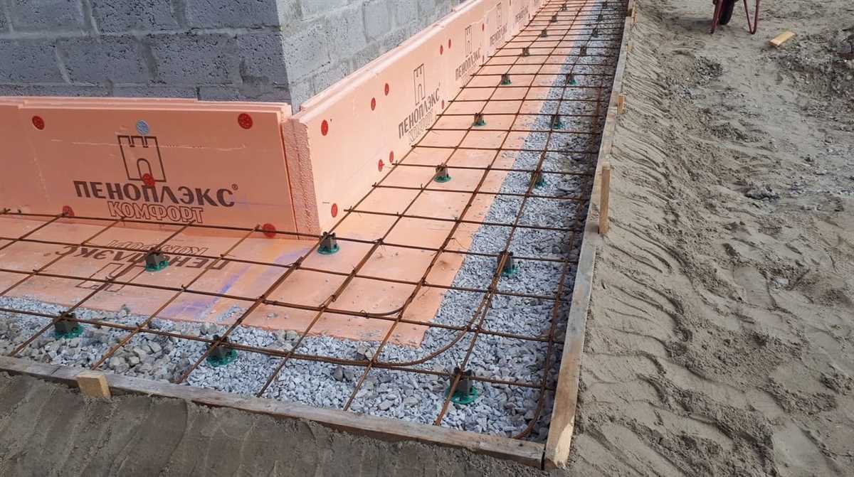 Далее проводится укладка арматуры. Для усиления отмостки используется металлическая арматура, которая предотвращает образование трещин и увеличивает прочность конструкции. Арматура должна быть расположена на расстоянии около 5-10 см от поверхности и должна создавать несущую сетку по всей площади отмостки.
