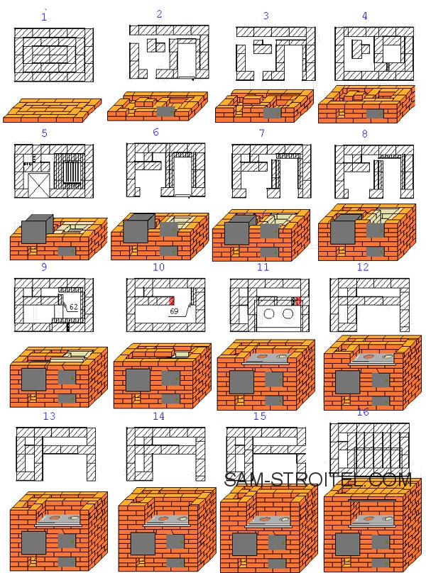 Кирпичная печь с варочной панелью, подробная порядовка для кладки кирпича своими руками.