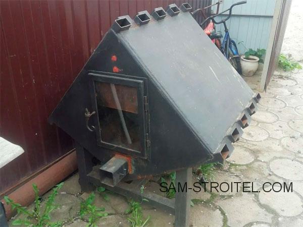 Конструкция выглядит следующим образом: из профильных труб сделаны воздушные теплообменники, весь корпус обварен листовым металлом. В переднюю дверцу топки вставлено калёное стекло чтобы можно было наблюдать процесс горения.