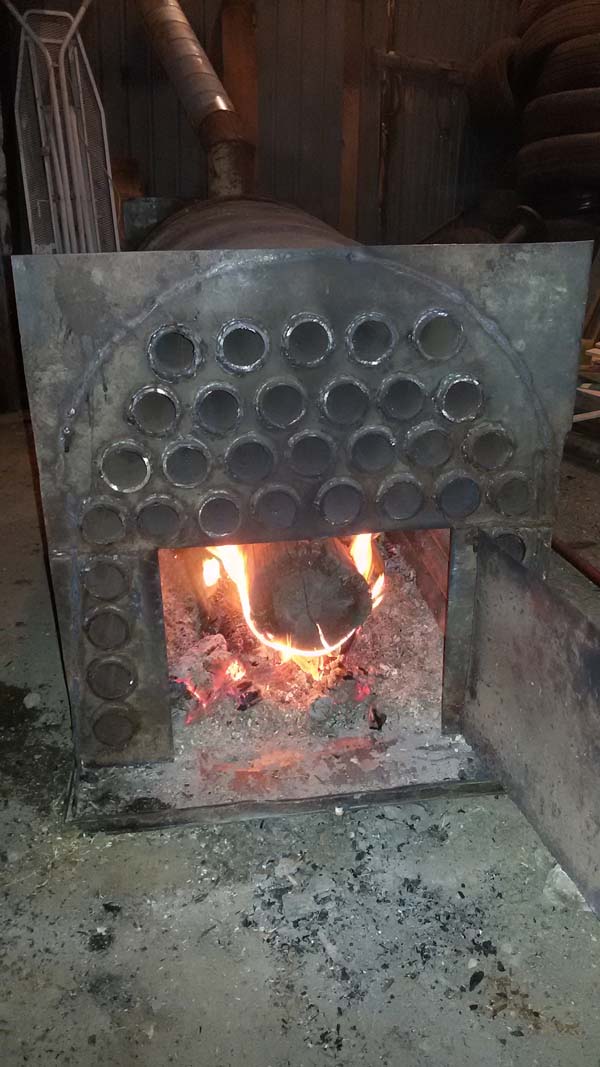 Корпус печки сварен из листового металла толщиной 3 мм, верхняя часть сделана из разрезанных 200 литровых бочек. Вдоль всей печи проходят трубы воздушного теплообменника.