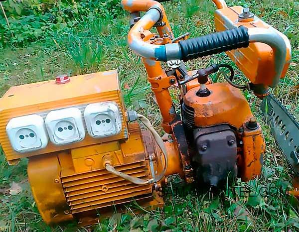 Вся суть самоделки заключалась в том, что нужно было скрестить бензопилу “Урал” с обычным асинхронным двигателем на 1,5 кВт. в режиме генератора. И ему это удалось сделать. Он переделал обмотку и подключил к ним конденсаторы.
